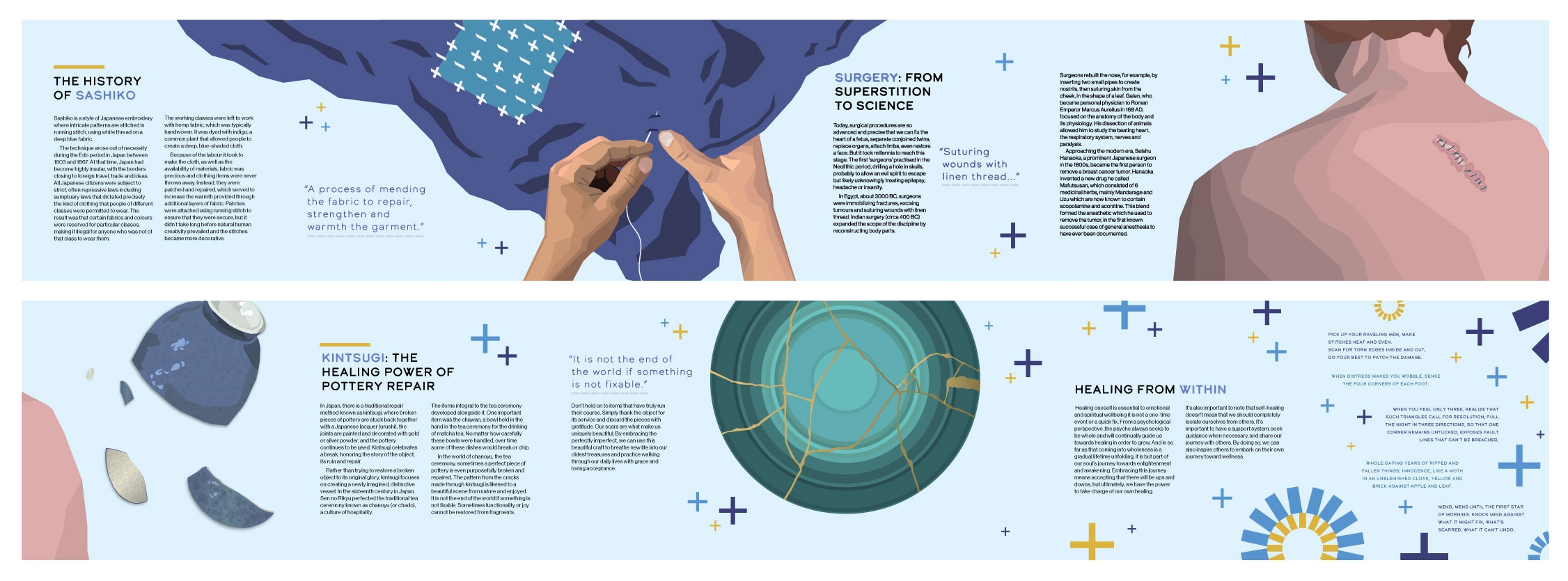 An accordion fold zine formatted as a visual narrative demonstrating the versatility of mending.